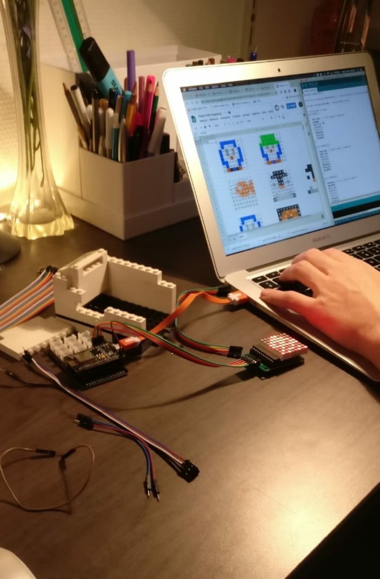 Na dit gedaan te hebben hebben we met wat knutselwerk een prototype in elkaar gezet. Dit hebben we kunnen doen met basic Arduino code, de benodigde spullen zoals een LED scherm, draadjes en een NodeMCU.