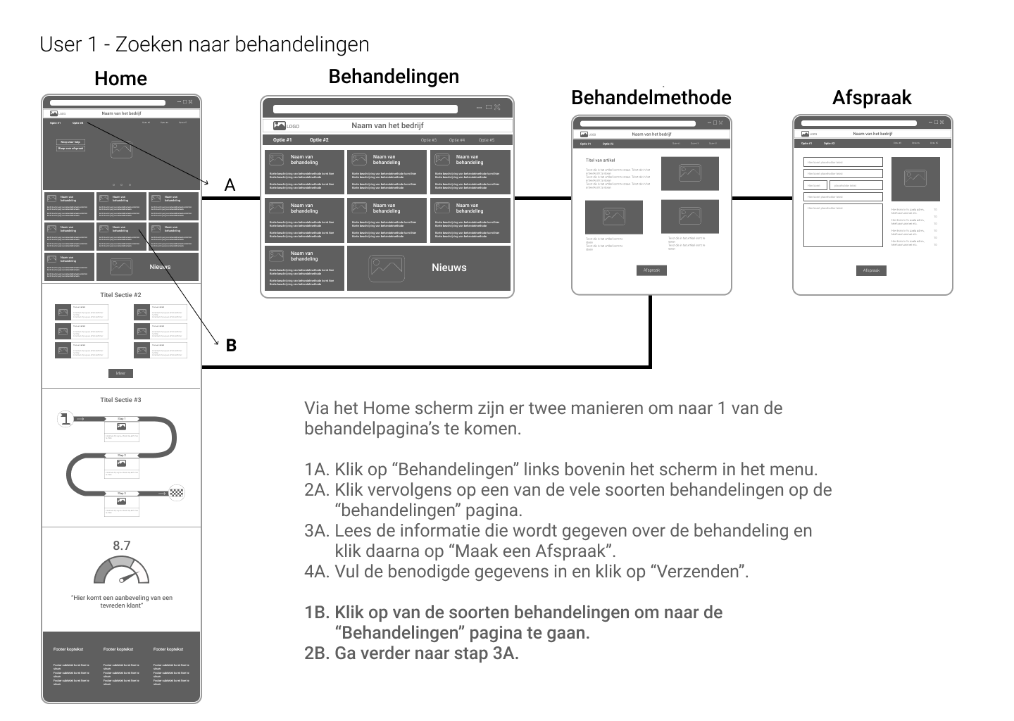 Hiernaast kun je één van de de userflows zien die ik heb ontworpen. Deze specifieke user had het doel om naar de "behandelingen" pagina te gaan.