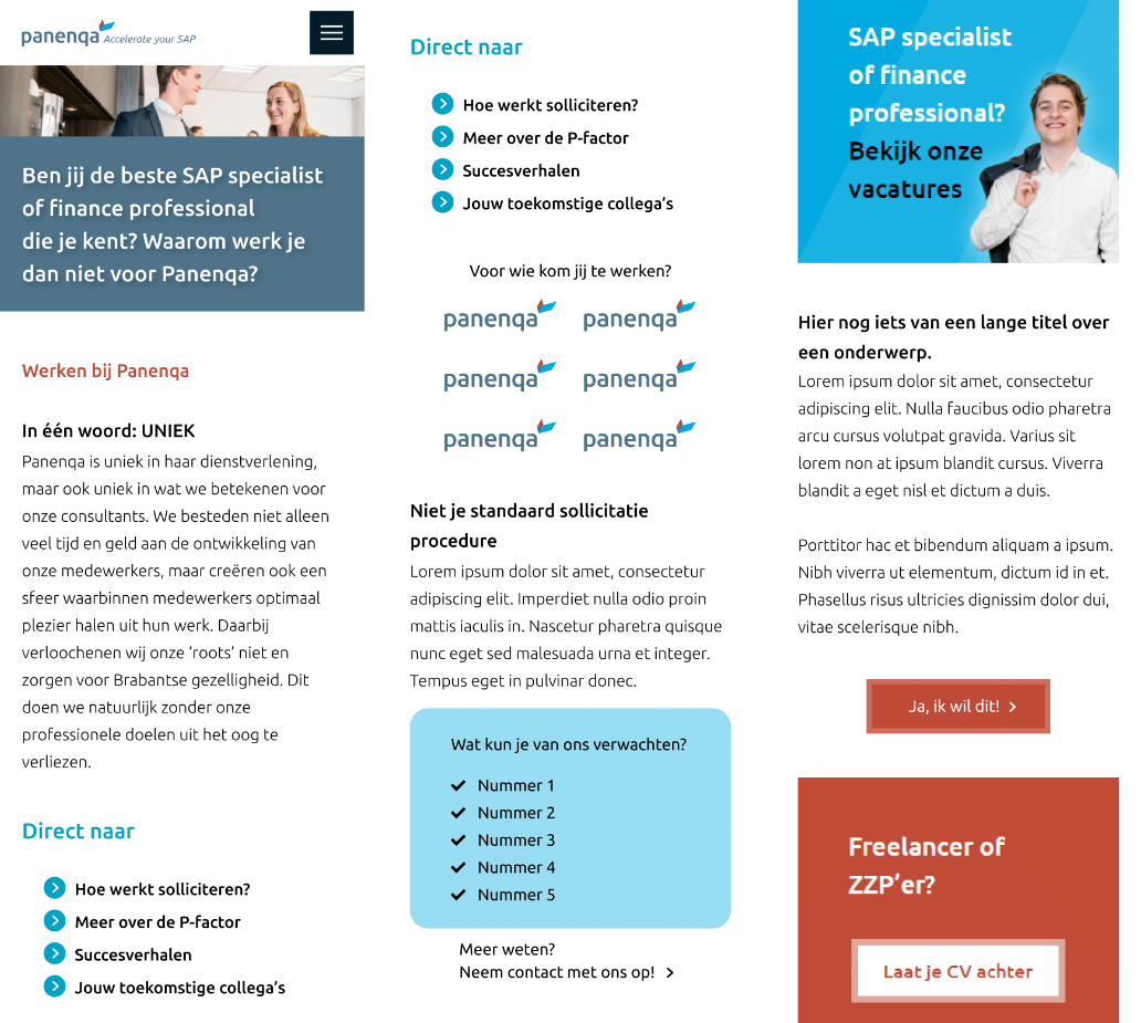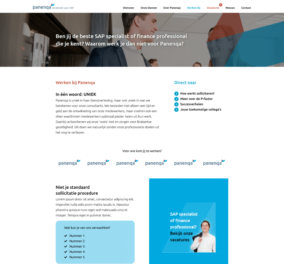 De opdrachtgever Panenqa, een SAP specialist bedrijf, had de opdracht om een vacature-pagina te ontwerpen voor hun website. De opgevraagde pagina moest in de bestaande huisstijl worden geïmplementeerd. Alles moest dus zijn zoals de originele website, van afmetingen tot kleurgebruik en lettertypes.