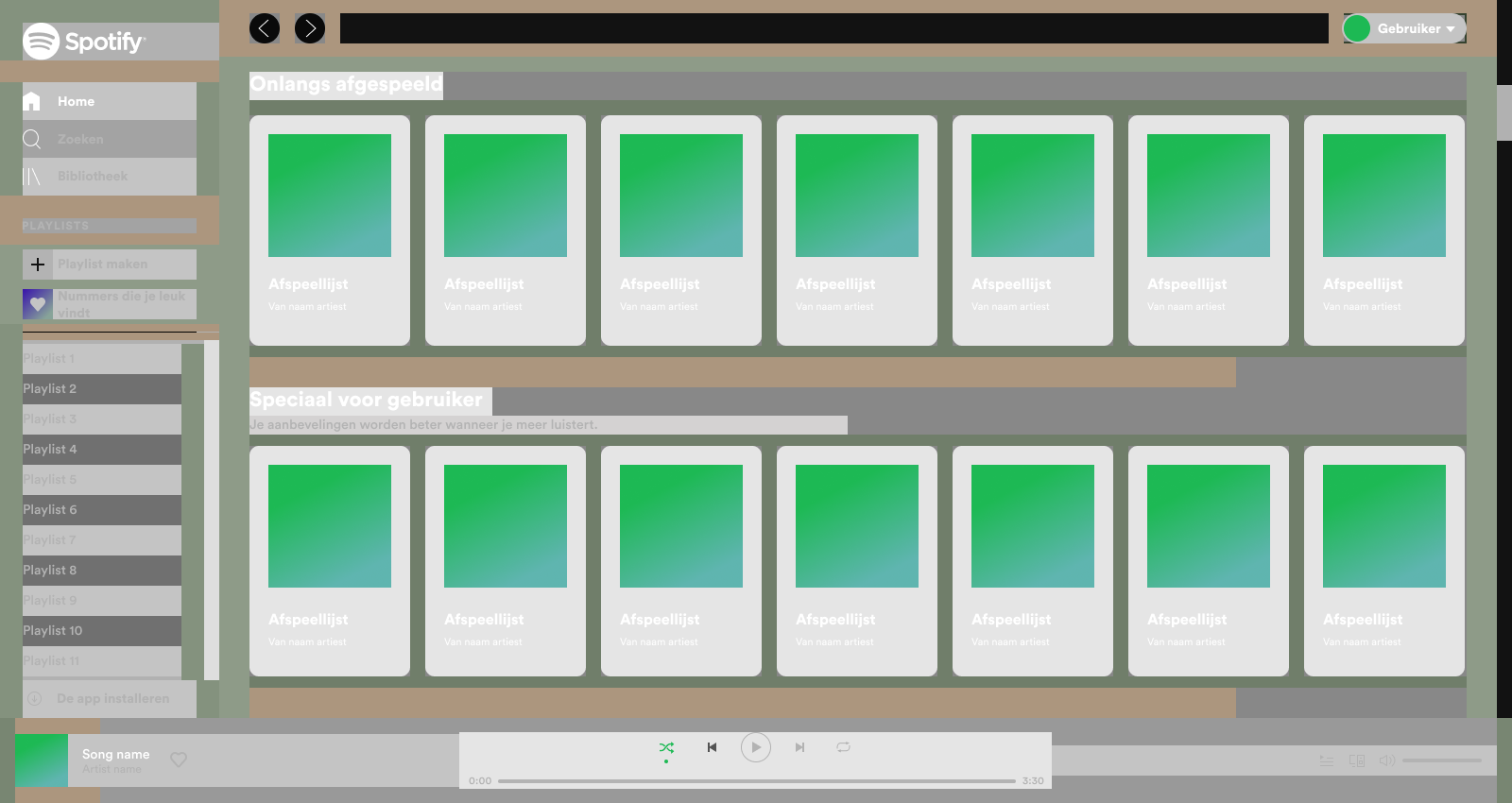 Dit deed ik voor web-app Spotify. Ik begon door de web-app te inspecteren en alle afmetingen, kleurgebruik en iconen te noteren. Deze informatie had ik opgenomen in een handige brandbook-vorm binnen Figma.